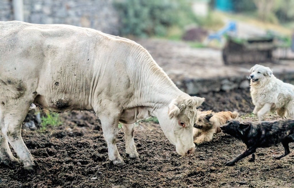 photo d’illustration : Vegan du haut de ses un an et demi fait face à une Charolaise récalcitrante à rentrer en stabulation.